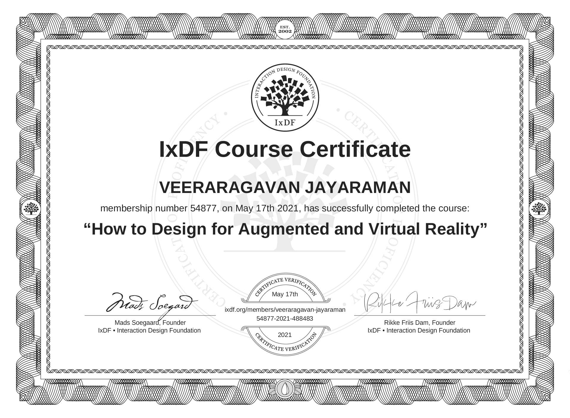 The IxDF Course Certificate (ID #6fae59a2-2581-4ceb-bc55-53023da59aea) above is awarded to VEERARAGAVAN JAYARAMAN in formal recognition of their coursework surpassing the rigorous benchmarks of exceptional performance established by the IxDF Educational Codex. View Course Curriculum.