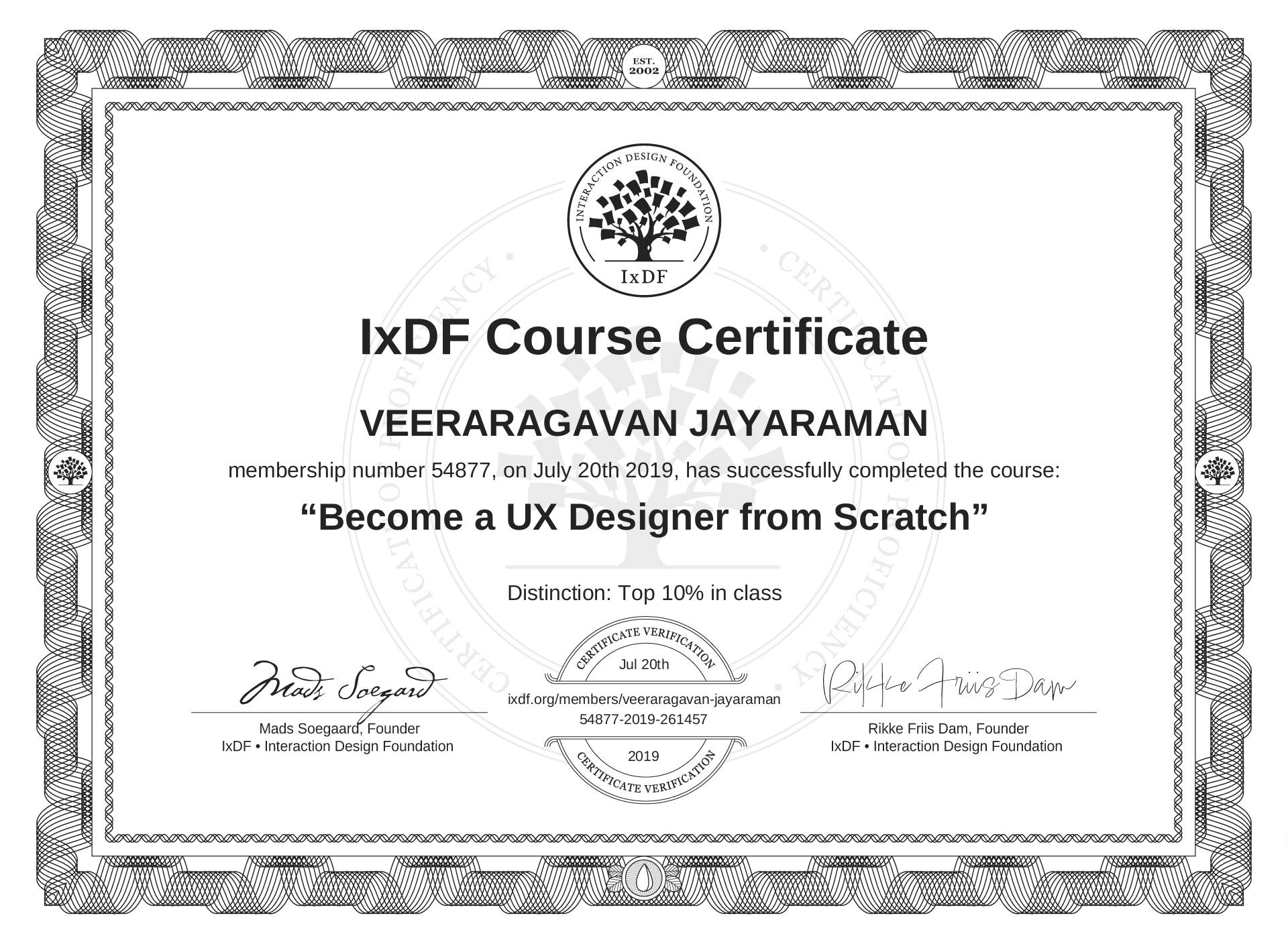 The IxDF Course Certificate (ID #PXF8sTb4Z) above is awarded to VEERARAGAVAN JAYARAMAN with a Top 10% Distinction in formal recognition of their coursework surpassing the rigorous benchmarks of exceptional performance established by the IxDF Educational Codex. View Course Curriculum.