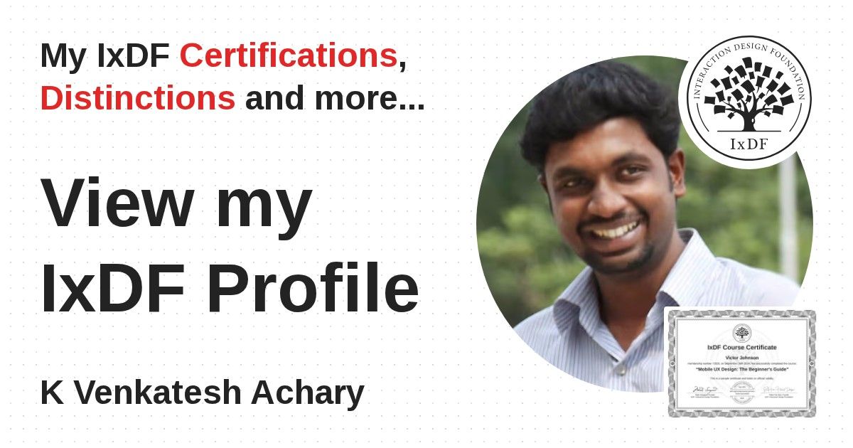 IxDF Course Certificates are awarded to K Venkatesh Achary in formal recognition of their coursework surpassing the rigorous benchmarks of exceptional performance established by the IxDF Educational Codex.