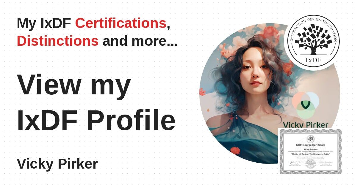 IxDF Course Certificates are awarded to Vicky Pirker in formal recognition of their coursework surpassing the rigorous benchmarks of exceptional performance established by the IxDF Educational Codex.