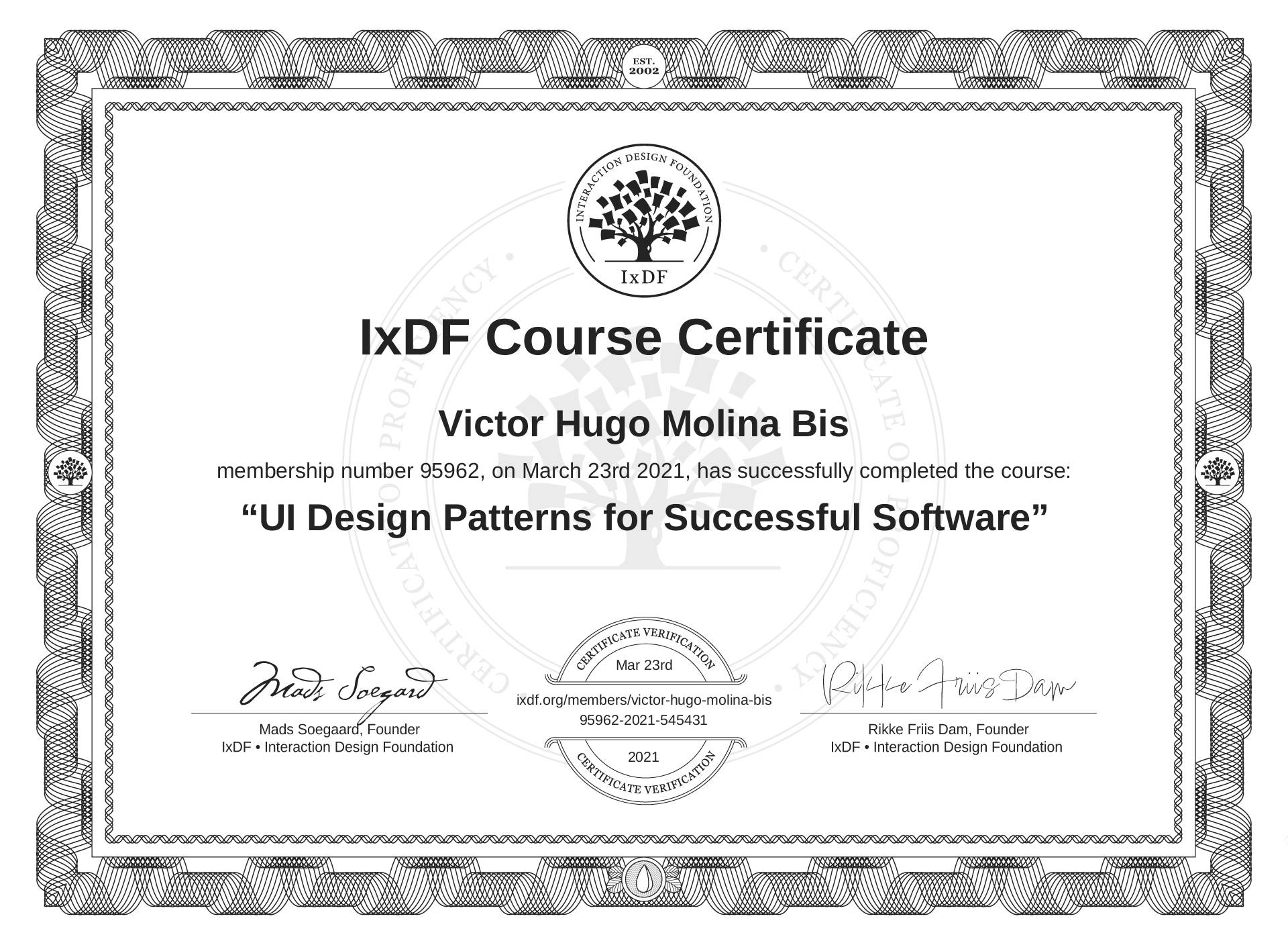 The IxDF Course Certificate (ID #24171c03-55d1-44ef-8cf1-7ee8fab1dde6) above is awarded to Victor Hugo Molina Bis