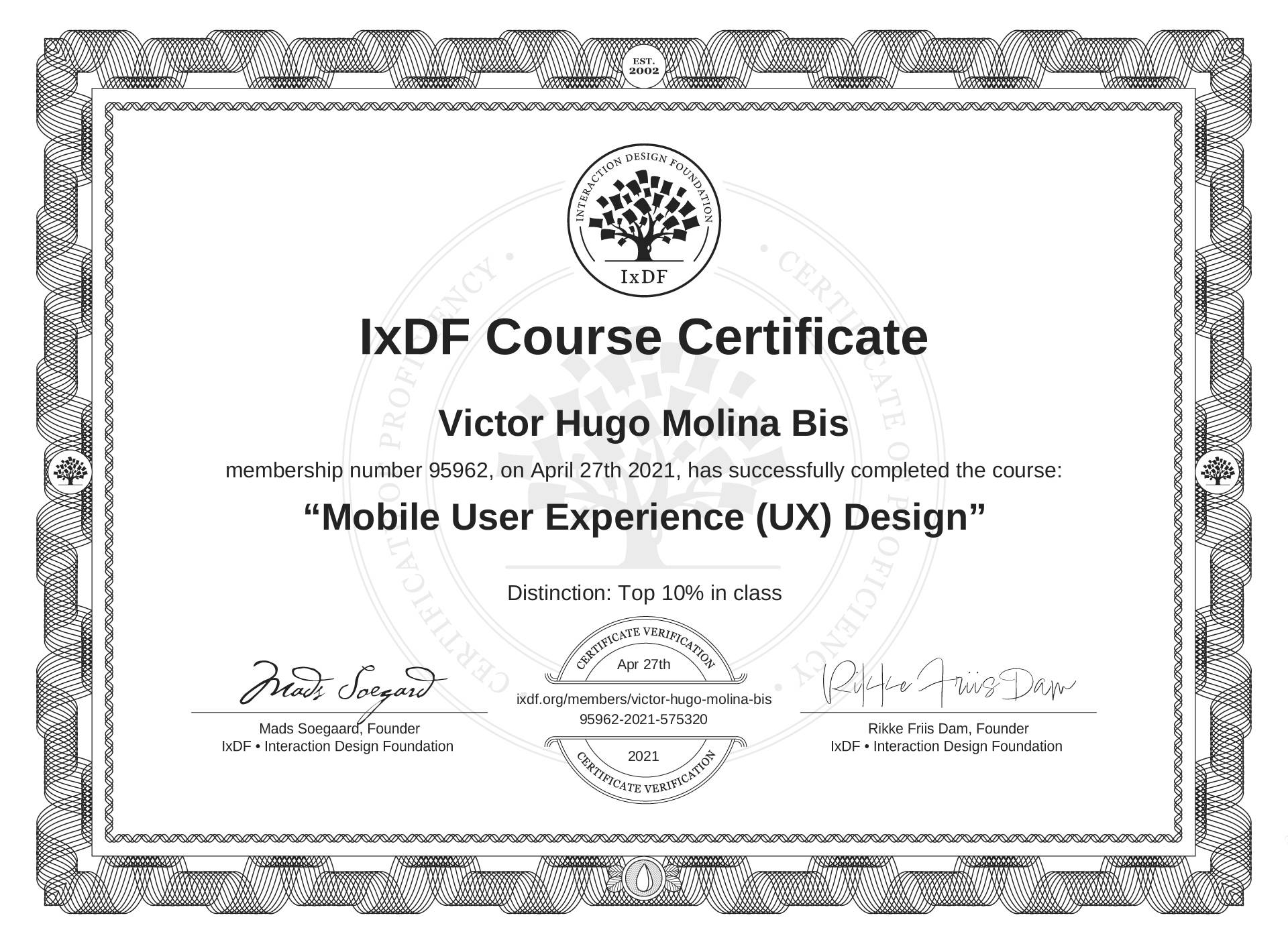 The IxDF Course Certificate (ID #5ed82432-4c70-4761-8453-bc8dd4000948) above is awarded to Victor Hugo Molina Bis