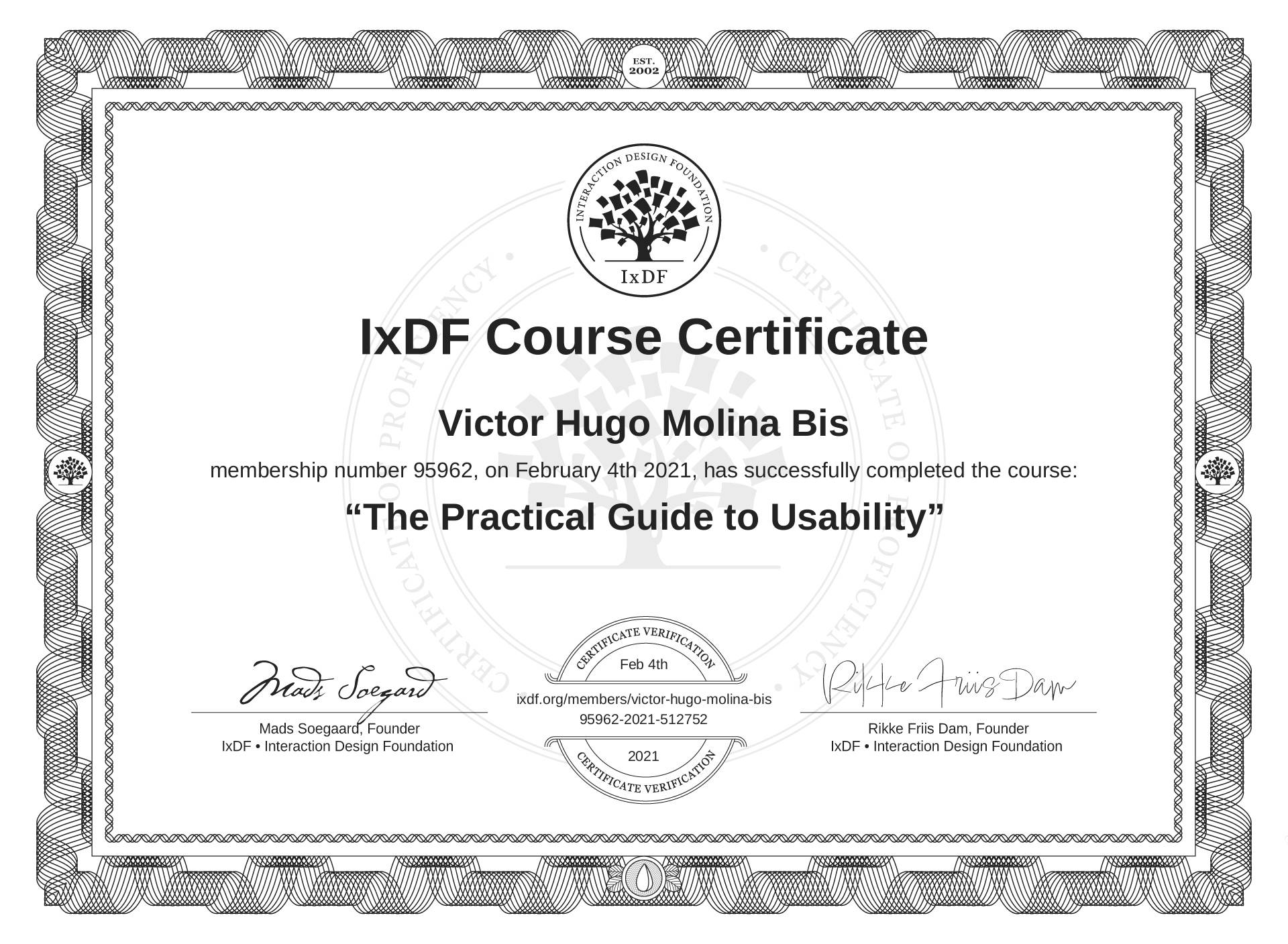 The IxDF Course Certificate (ID #60c8ccb0-ed19-4201-a9d3-e403468e743d) above is awarded to Victor Hugo Molina Bis