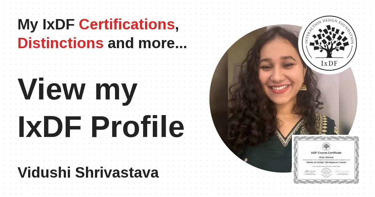 IxDF Course Certificates are awarded to Vidushi Shrivastava in formal recognition of their coursework surpassing the rigorous benchmarks of exceptional performance established by the IxDF Educational Codex.