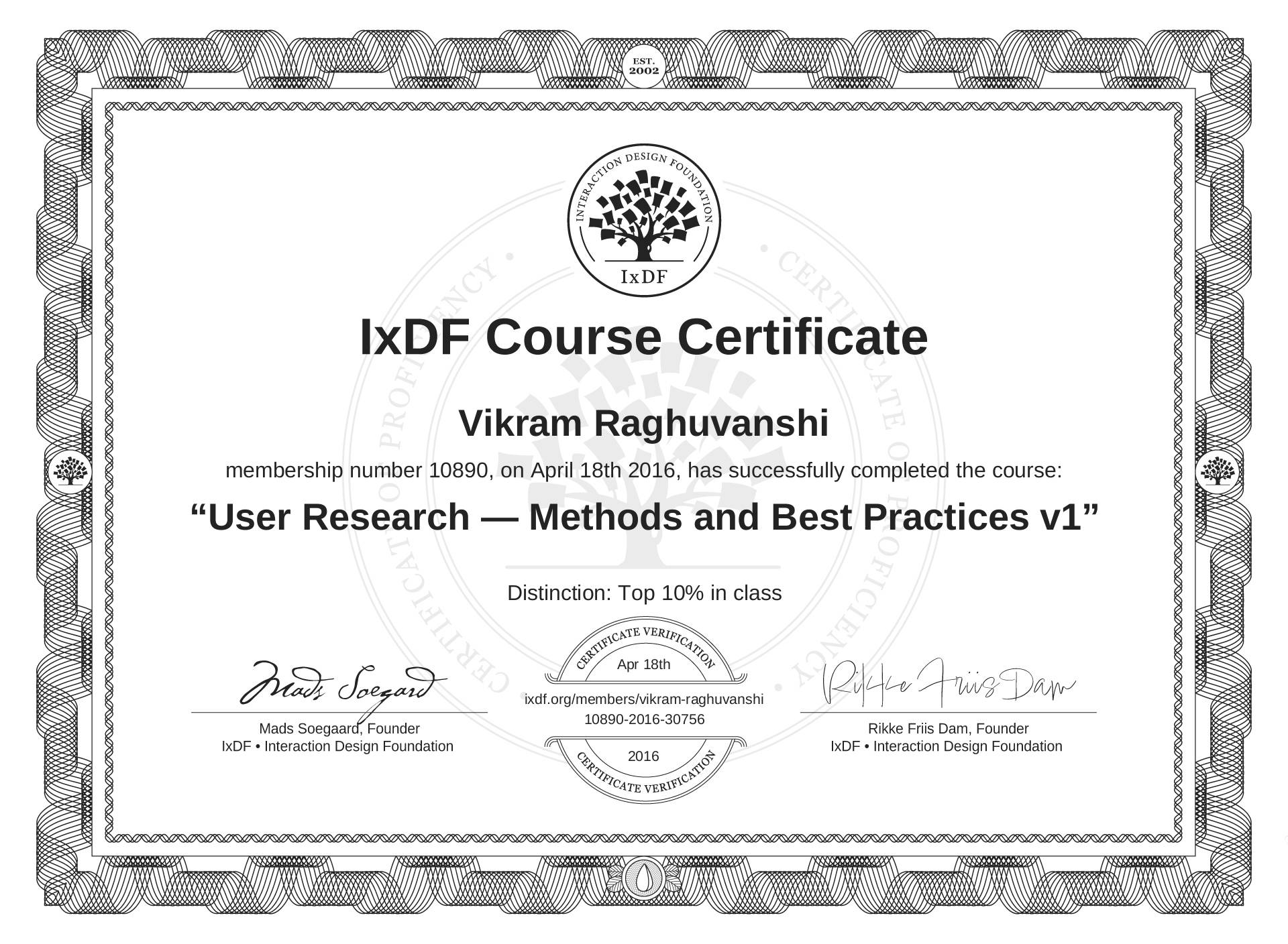 The IxDF Course Certificate (ID #MbQVSkpTG) above is awarded to Vikram Raghuvanshi with a Top 10% Distinction in formal recognition of their coursework surpassing the rigorous benchmarks of exceptional performance established by the IxDF Educational Codex. View Course Curriculum.