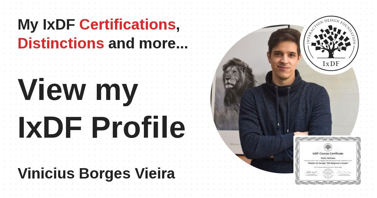 IxDF Course Certificates are awarded to Vinicius Borges Vieira in formal recognition of their coursework surpassing the rigorous benchmarks of exceptional performance established by the IxDF Educational Codex.