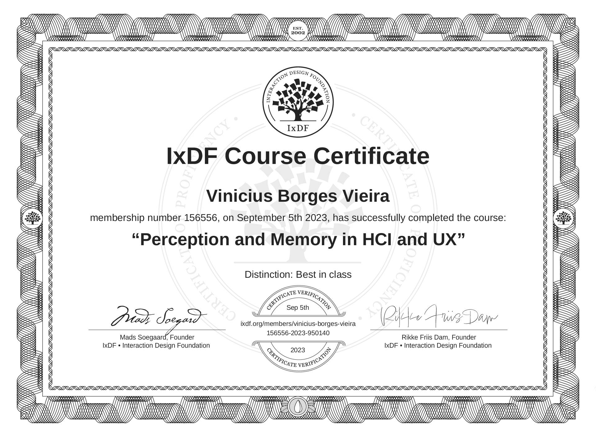 The IxDF Course Certificate (ID #59e1464e-0b1d-4f28-aff6-ddec0889be1f) above is awarded to Vinicius Borges Vieira