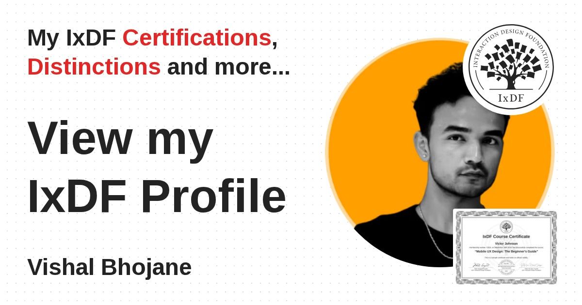 IxDF Course Certificates are awarded to Vishal Bhojane in formal recognition of their coursework surpassing the rigorous benchmarks of exceptional performance established by the IxDF Educational Codex.