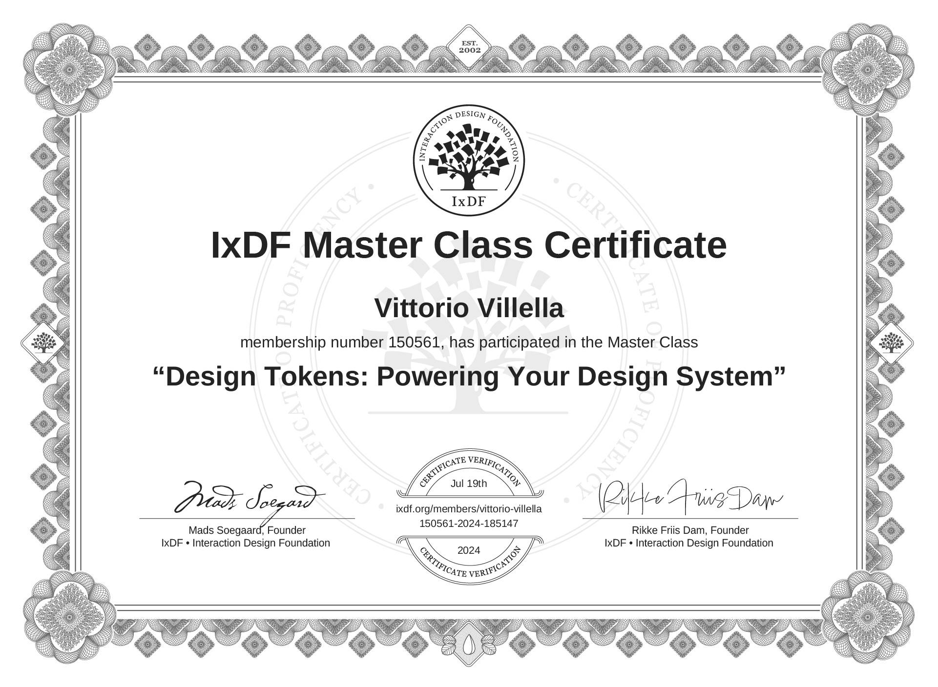 This IxDF Membership Certificate is issued to Vittorio Villella