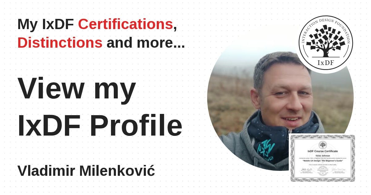 IxDF Course Certificates are awarded to Vladimir Milenković in formal recognition of their coursework surpassing the rigorous benchmarks of exceptional performance established by the IxDF Educational Codex.