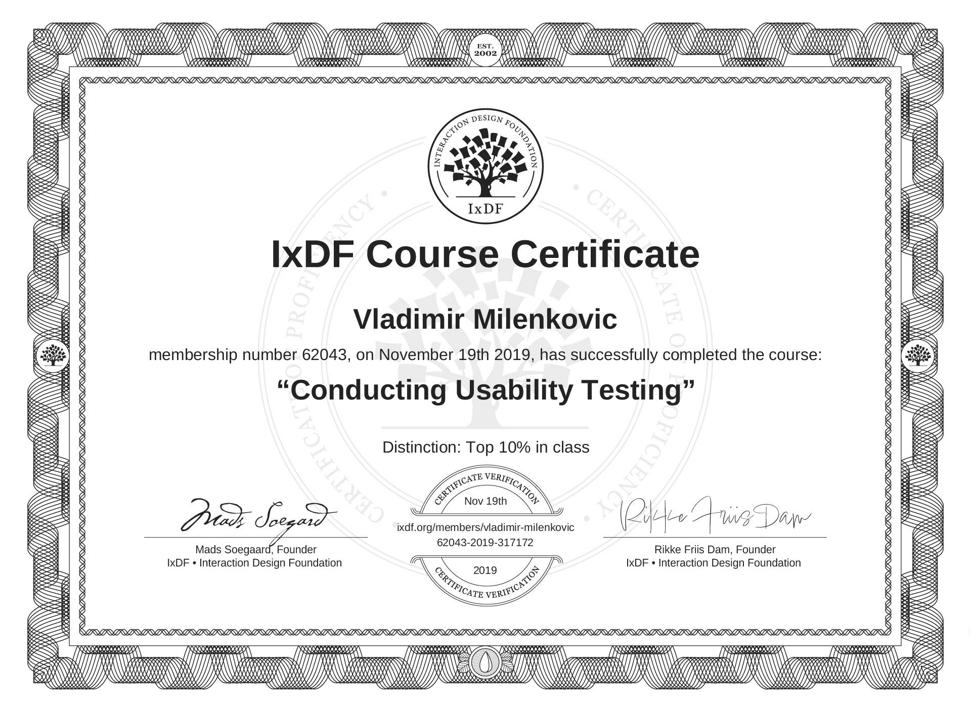 The IxDF Course Certificate (ID #fltqnHSHvW4d1ZnH2g) above is awarded to Vladimir Milenković
