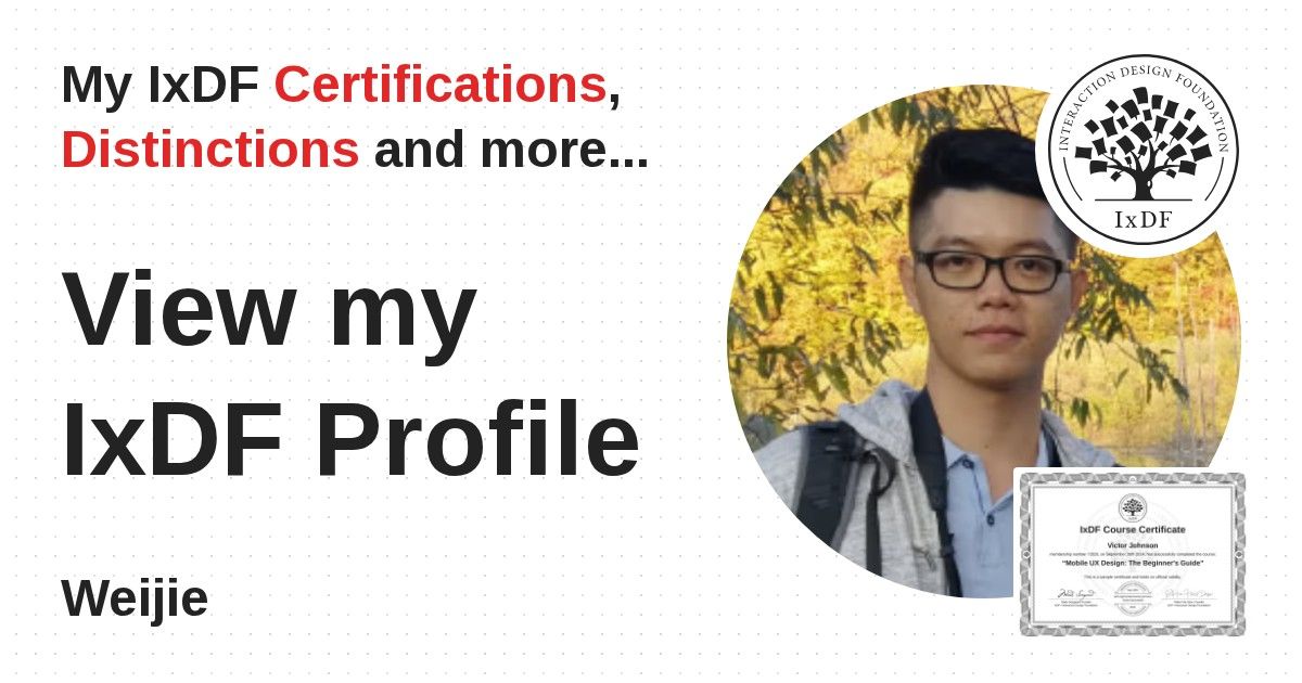 IxDF Course Certificates are awarded to Weijie in formal recognition of their coursework surpassing the rigorous benchmarks of exceptional performance established by the IxDF Educational Codex.