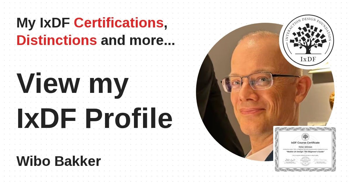 IxDF Course Certificates are awarded to Wibo Bakker in formal recognition of their coursework surpassing the rigorous benchmarks of exceptional performance established by the IxDF Educational Codex.