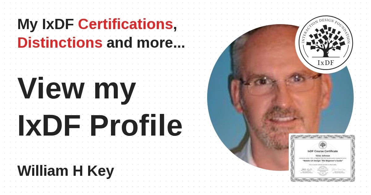 IxDF Course Certificates are awarded to William H Key in formal recognition of their coursework surpassing the rigorous benchmarks of exceptional performance established by the IxDF Educational Codex.