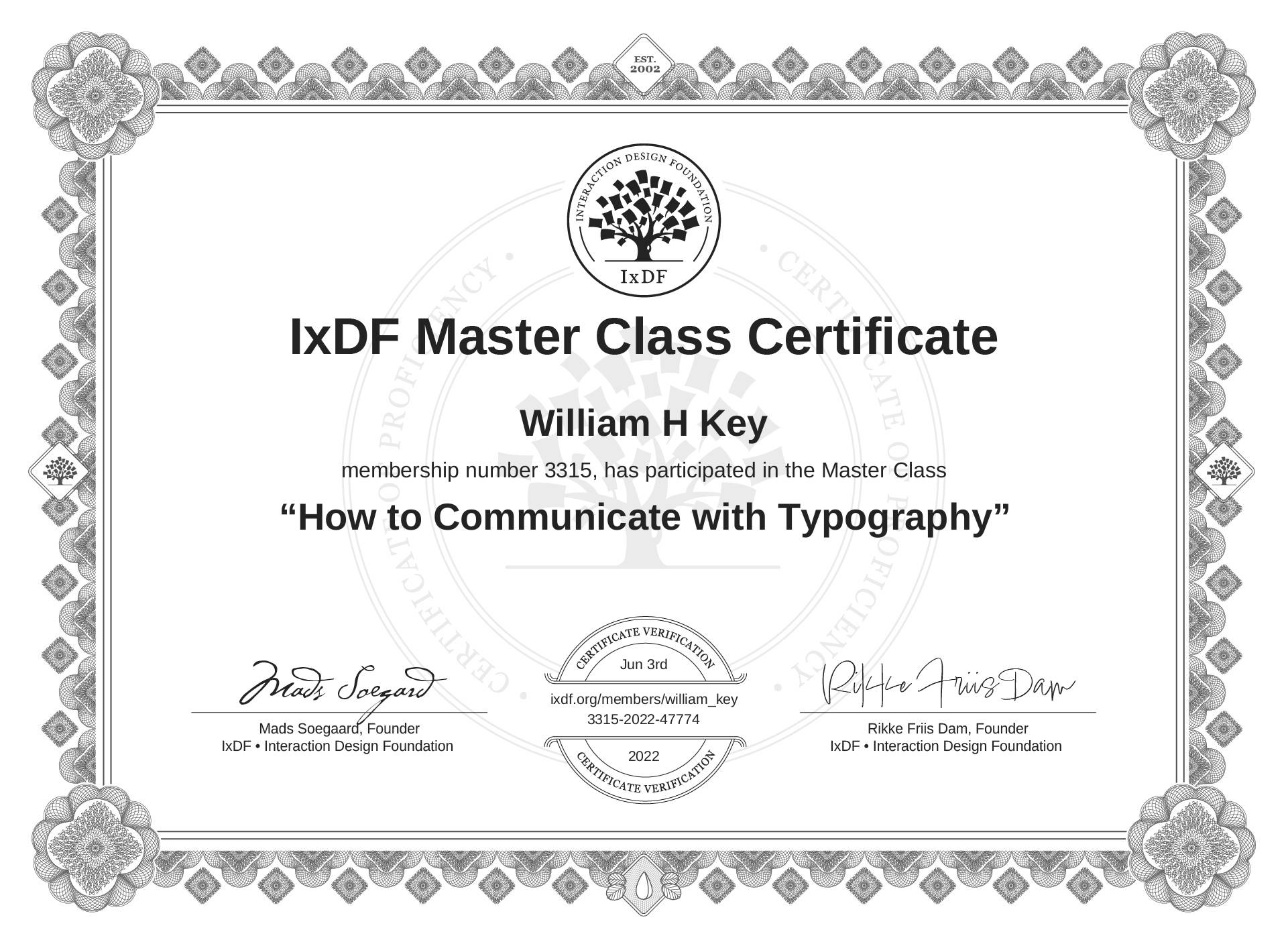 The IxDF Master Class Certificate (ID #mcc_427861d59ed245bbb0fc6a6c8b715f6b) above is awarded to William H Key in formal recognition of their participation in the Master Class How to Communicate with Typography .