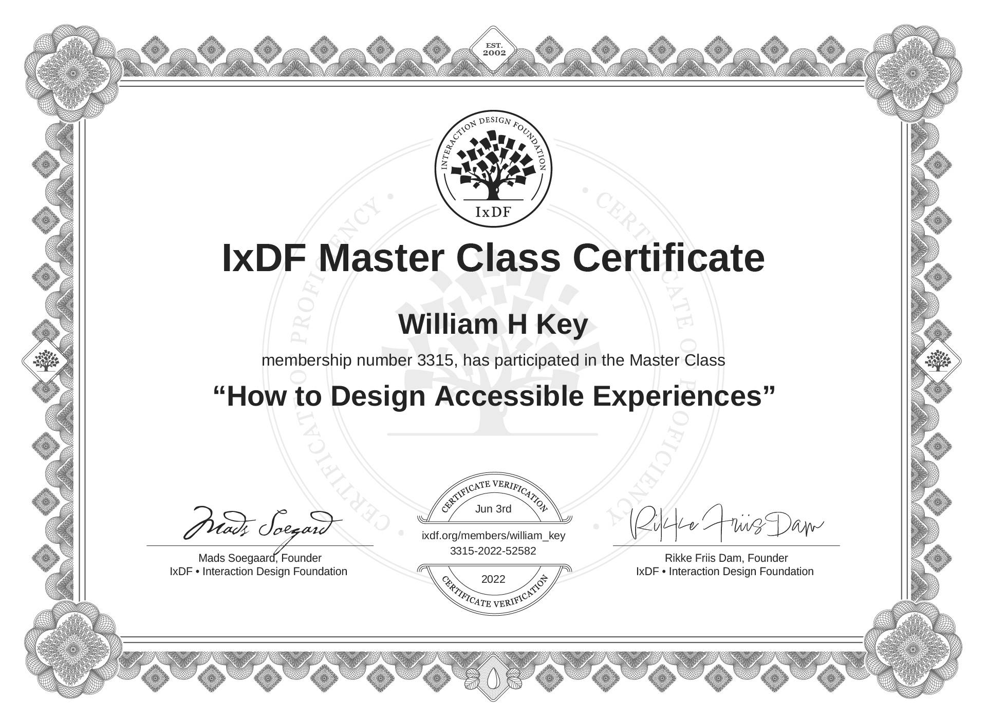 IxDF Master Class Certificates are awarded to William H Key in formal recognition of their attendance and ongoing commitment to learning from industry leaders.
