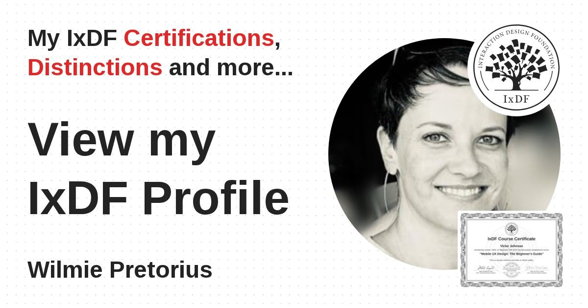 IxDF Course Certificates are awarded to Wilmie Pretorius in formal recognition of their coursework surpassing the rigorous benchmarks of exceptional performance established by the IxDF Educational Codex.