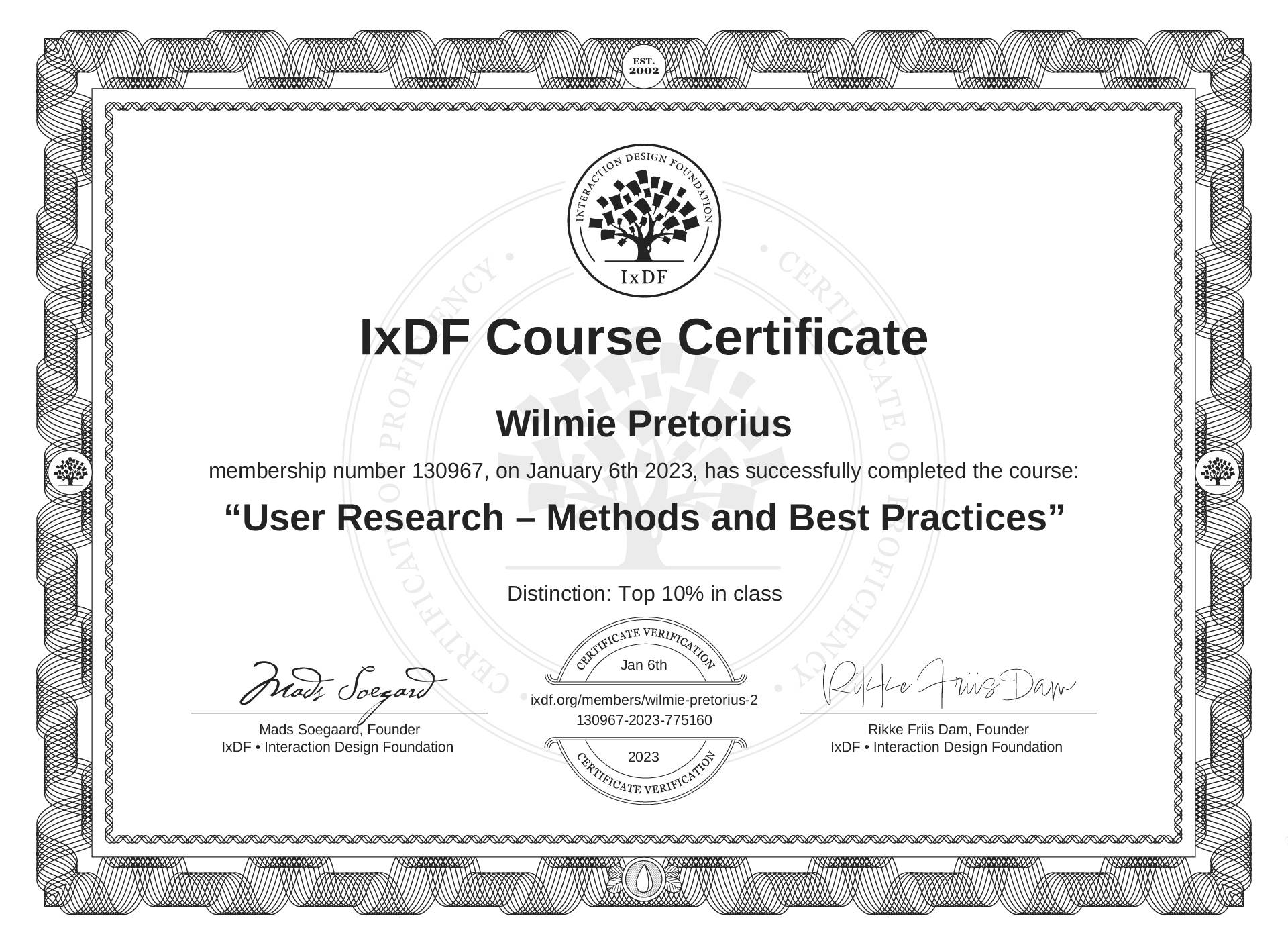 The IxDF Course Certificate (ID #f6696c79-6bad-47ca-9580-015c7ef9dfff) above is awarded to Wilmie Pretorius