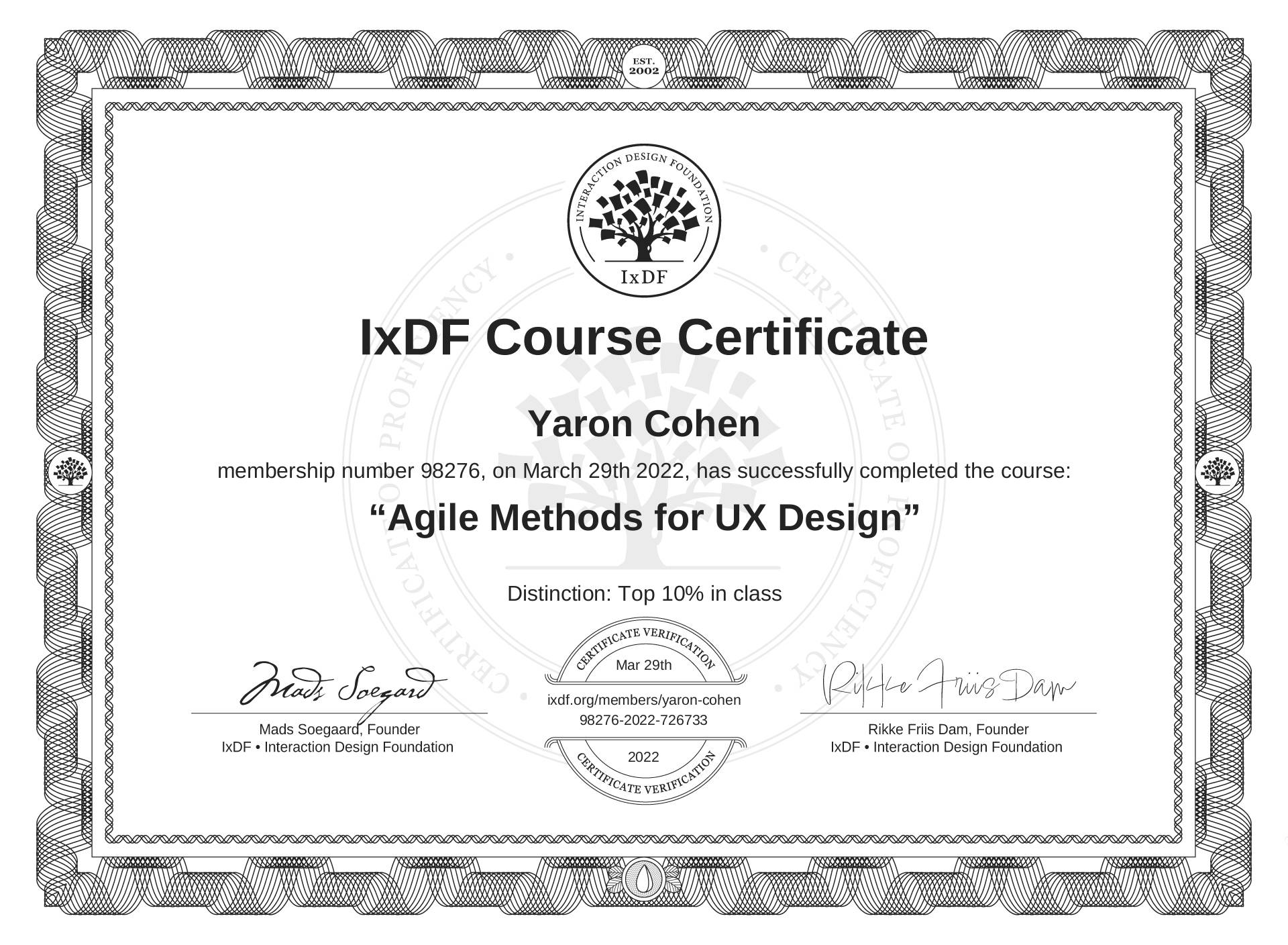 The IxDF Course Certificate (ID #079f6edc-f597-421a-85d2-e2005186addb) above is awarded to Yaron Cohen