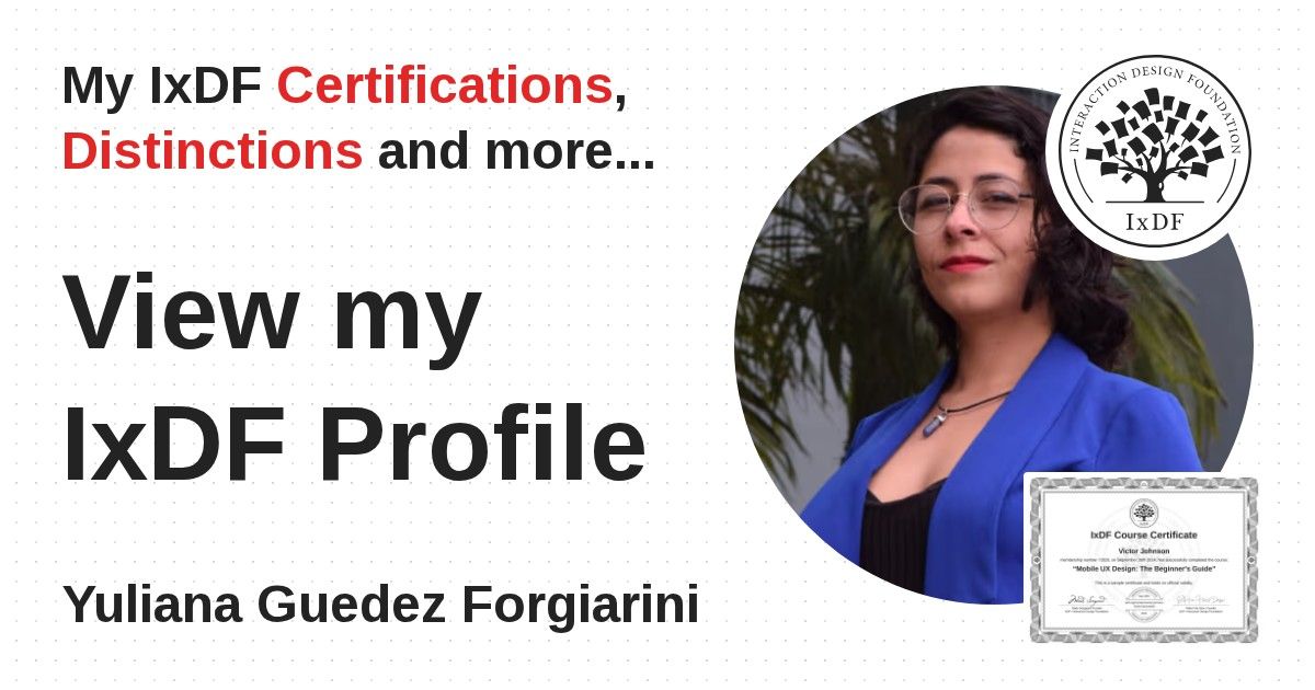 IxDF Course Certificates are awarded to Yuliana Guedez Forgiarini in formal recognition of their coursework surpassing the rigorous benchmarks of exceptional performance established by the IxDF Educational Codex.