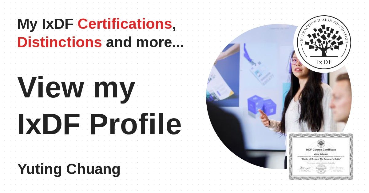 IxDF Course Certificates are awarded to Yuting Chuang in formal recognition of their coursework surpassing the rigorous benchmarks of exceptional performance established by the IxDF Educational Codex.