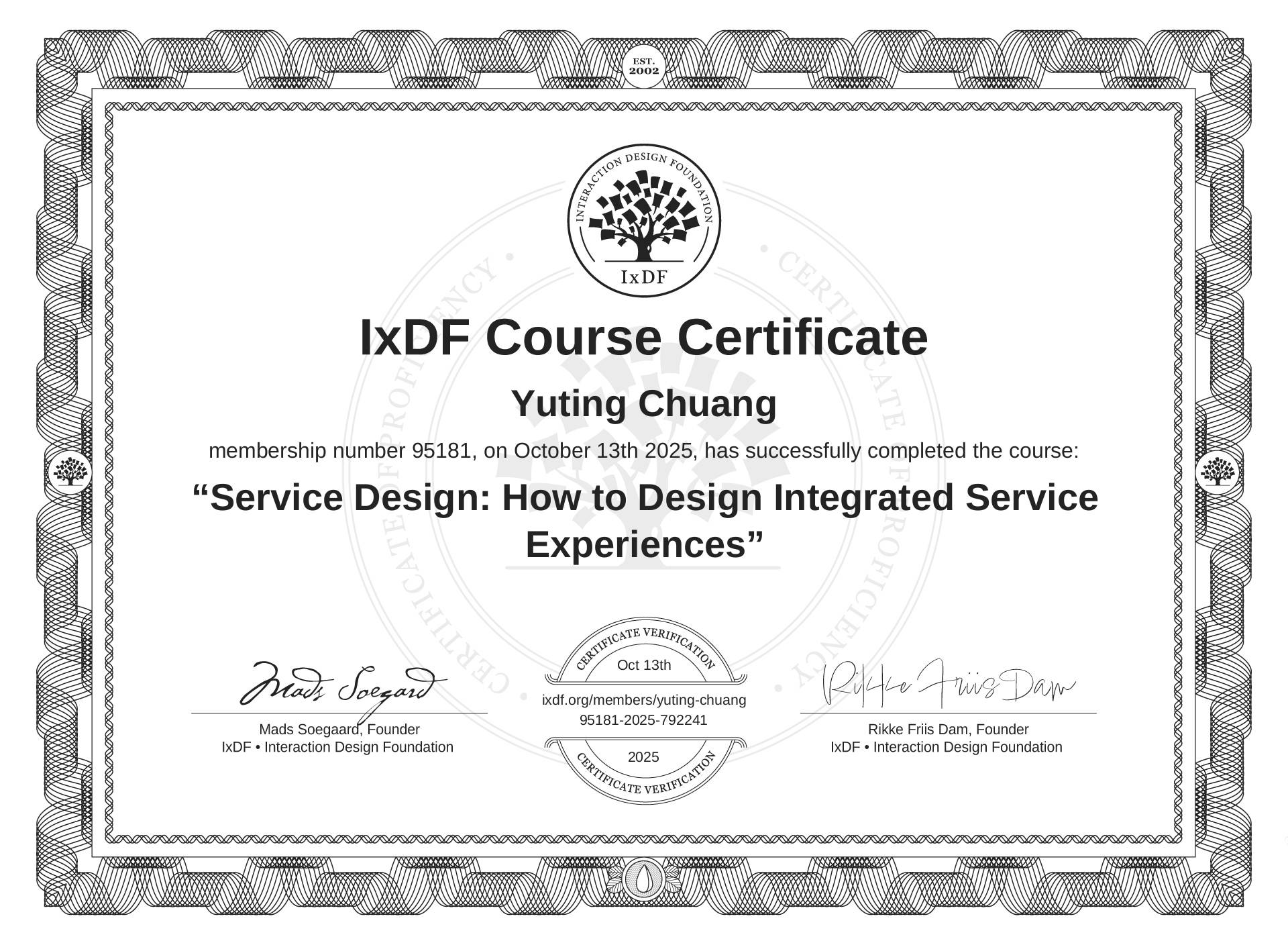 IxDF Course Certificate awarded to Yuting Chuang for completing the "Service Design: How to Design Integrated Service Experiences" course