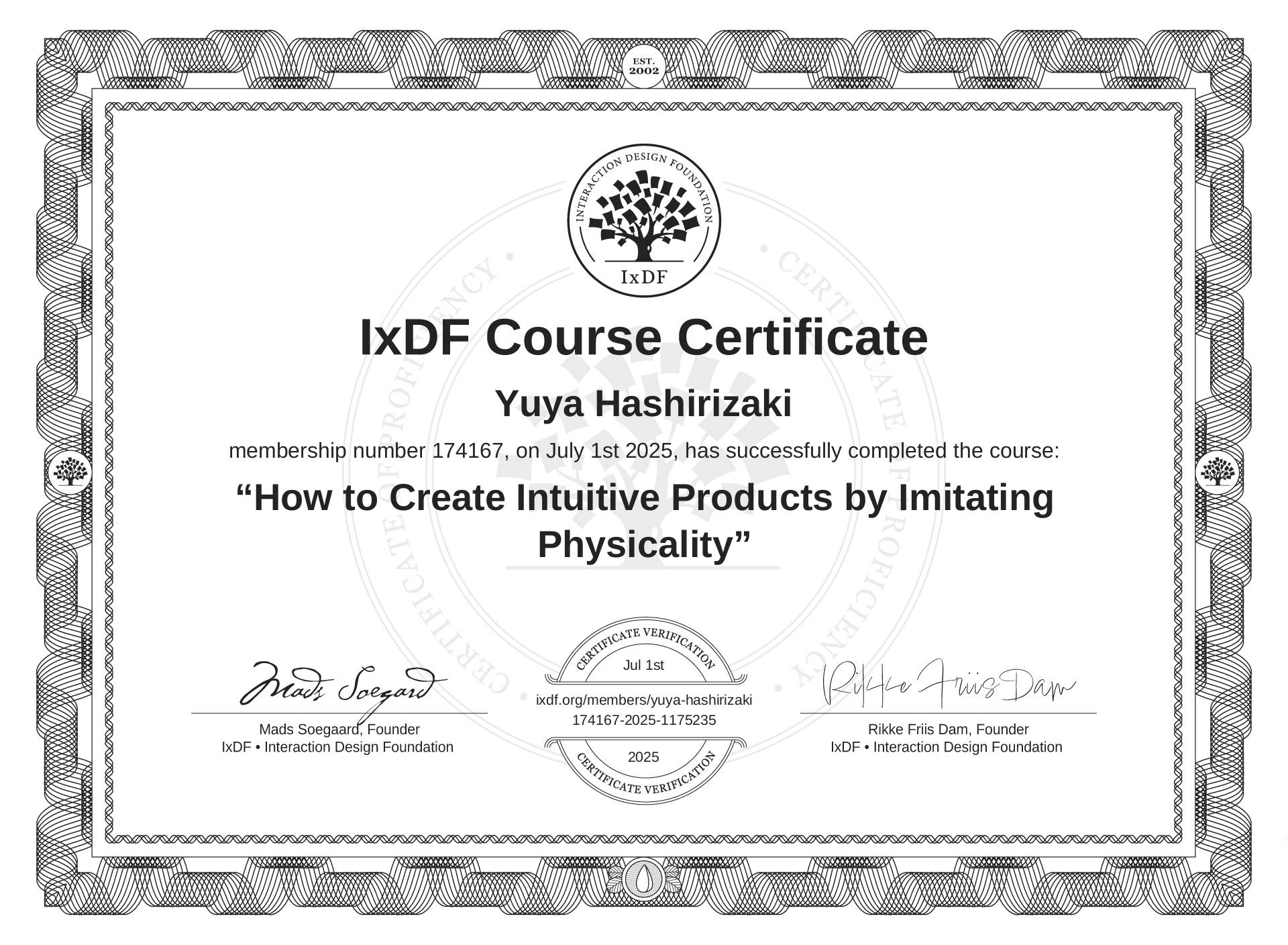 The IxDF Course Certificate (ID #64c7038d-ed35-4c68-9eac-1f55ee086dde) above is awarded to Yuya Hashirizaki in formal recognition of their coursework surpassing the rigorous benchmarks of exceptional performance established by the IxDF Educational Codex. View Course Curriculum.