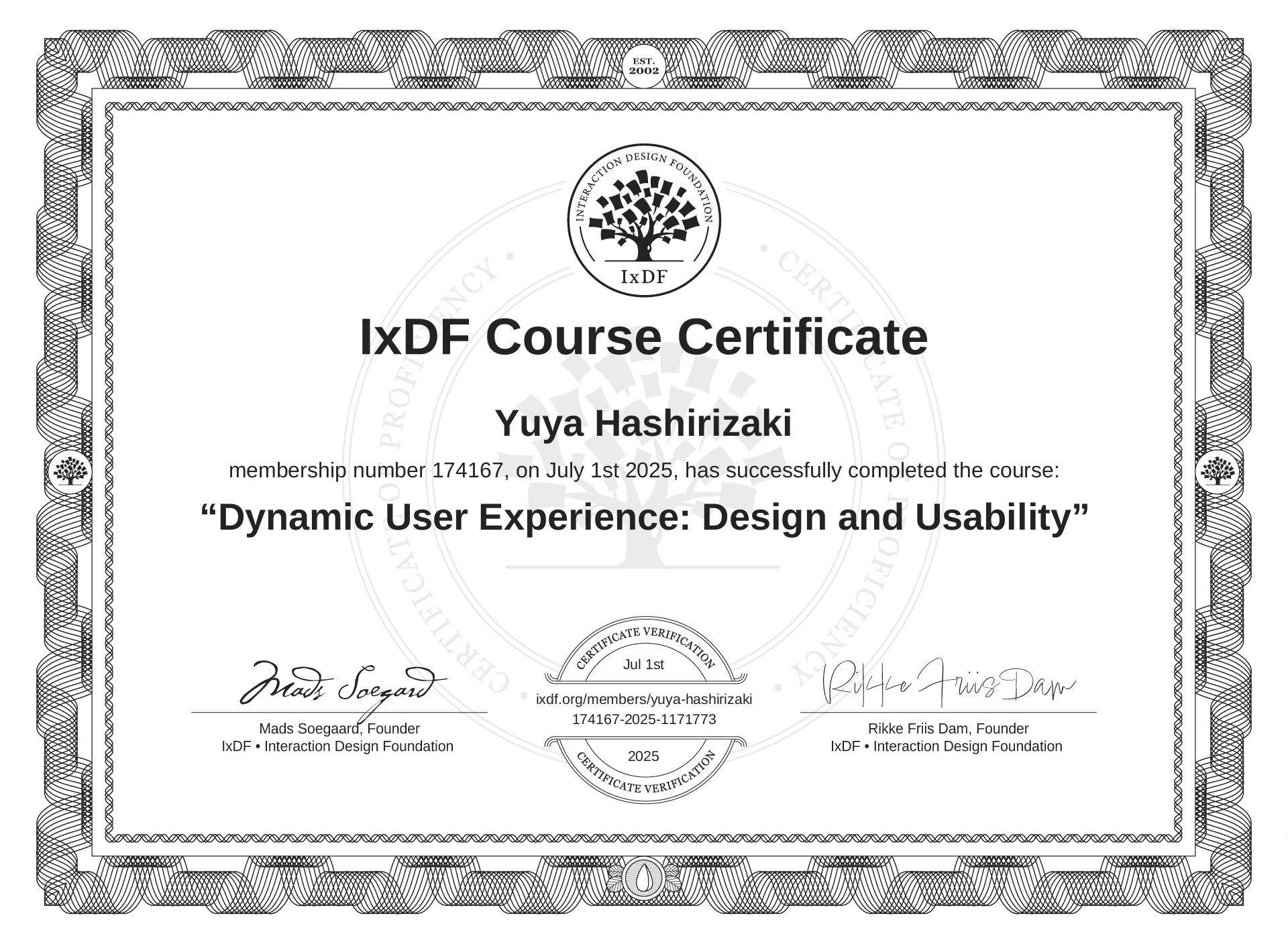 The IxDF Course Certificate (ID #ee7808e4-3b96-4102-b4b7-c764fe4a3912) above is awarded to Yuya Hashirizaki in formal recognition of their coursework surpassing the rigorous benchmarks of exceptional performance established by the IxDF Educational Codex. View Course Curriculum.