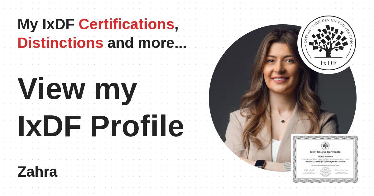 IxDF Course Certificates are awarded to Zahra in formal recognition of their coursework surpassing the rigorous benchmarks of exceptional performance established by the IxDF Educational Codex.