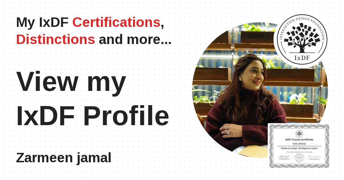 Distinctions are conferred upon Zarmeen jamal in formal recognition of their notable achievements and contributions, as stipulated by the IxDF Educational Codex.