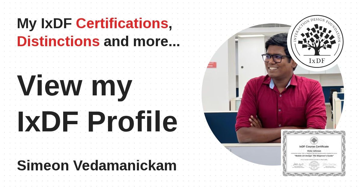 IxDF Course Certificates are awarded to Simeon Vedamanickam in formal recognition of their coursework surpassing the rigorous benchmarks of exceptional performance established by the IxDF Educational Codex.