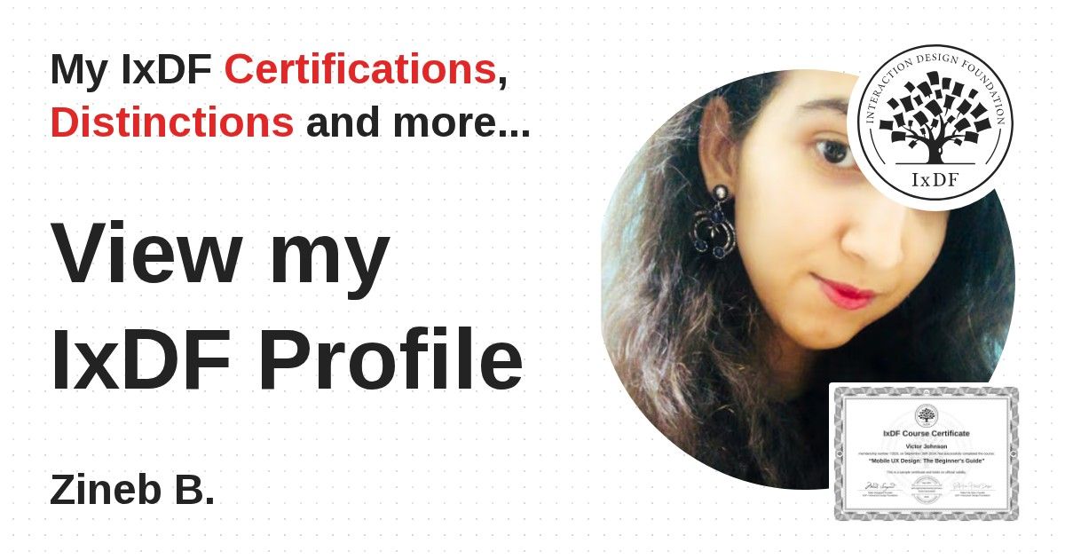 IxDF Course Certificates are awarded to Zineb B. in formal recognition of their coursework surpassing the rigorous benchmarks of exceptional performance established by the IxDF Educational Codex.
